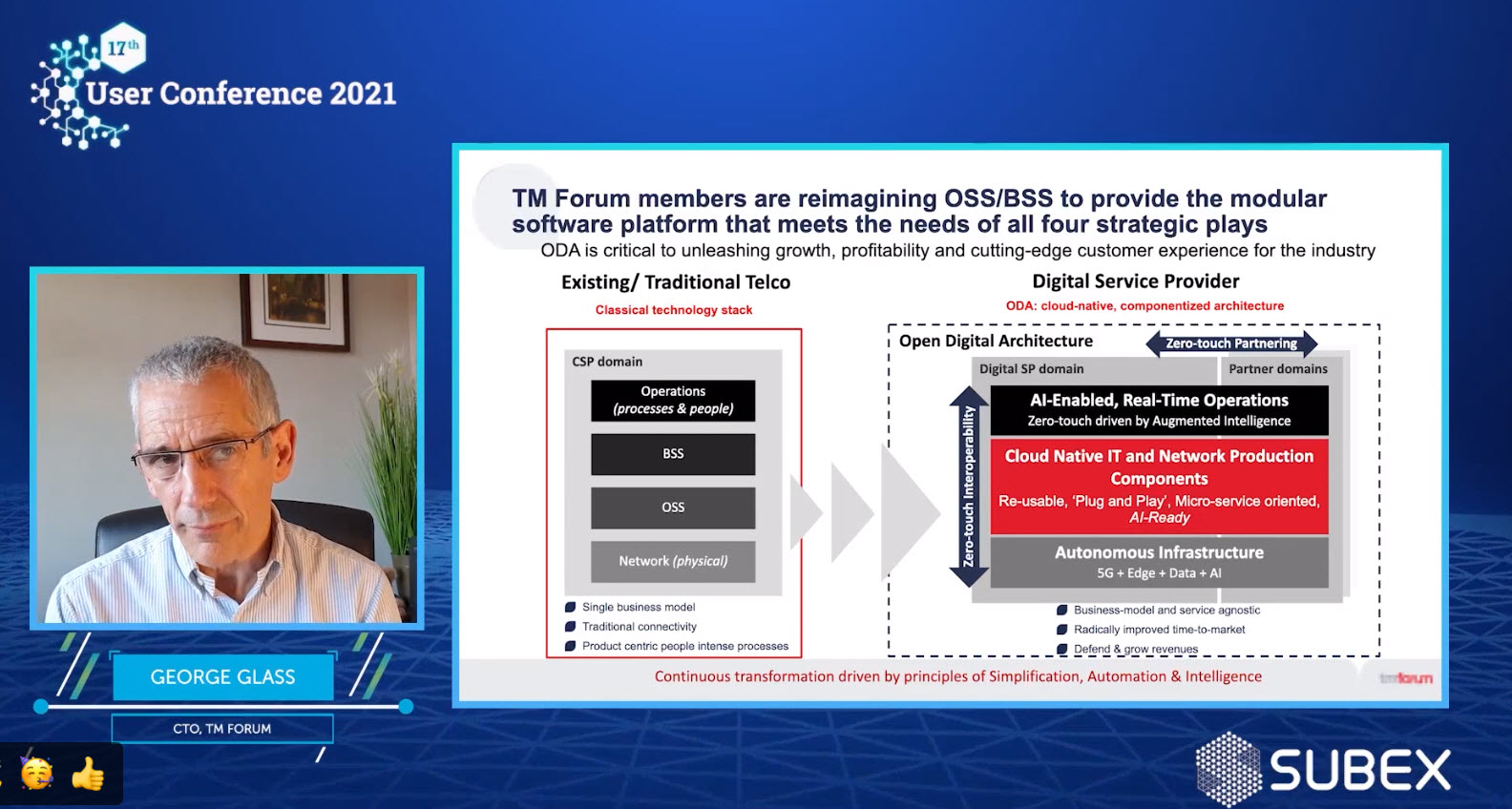 In common with other leading telecom software vendors, notably Amdocs, Subex has been transforming its tech to a cloud-native, and microservices-based architecture. As an industry direction, this was further reinforced by George Glass, former Chief Systems Architect for BT, and current CTO at the TMForum, who illustrated how conventional OSS and BSS boundaries are being replaced by open APIs: