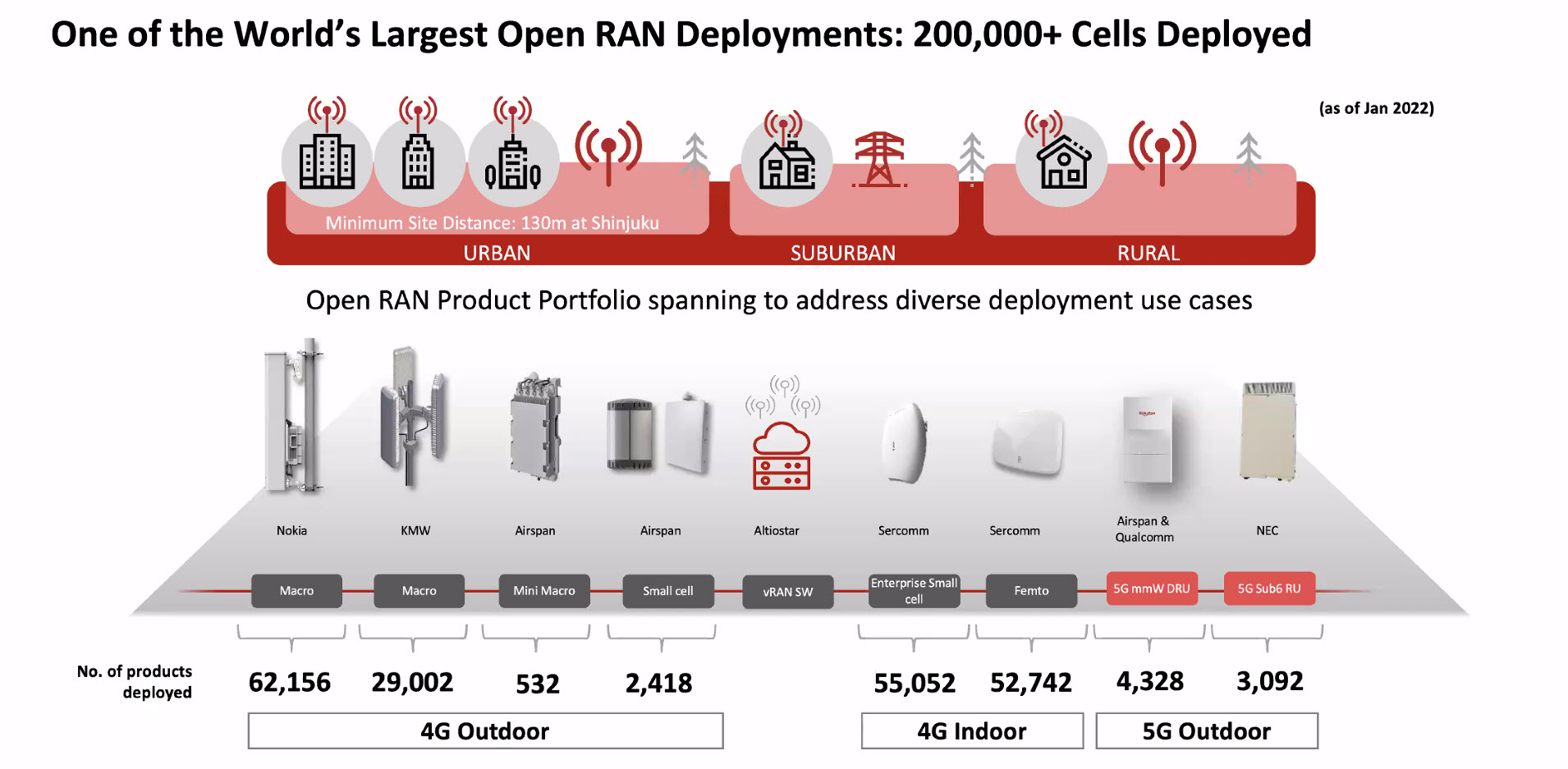Rakuten Mobile now has 200,000 open RAN cells are on air, a mix of 4G and 5G, indoor and outdoor; dense urban, suburban and rural. This includes 5G Massive MIMO, based on Open RAN.