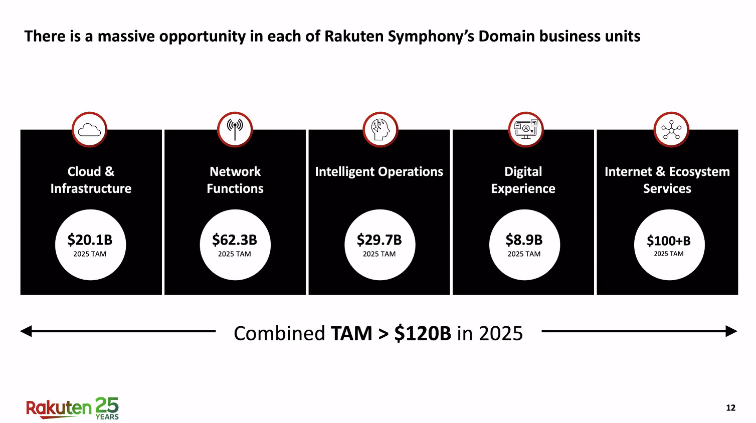 Rakuten’s vision has always been about more than open RAN. It is about hyperscale telecom, a significantly reduced cost base (capex and opex); automation, innovation, and speed. Amin shared how Symphony stacks up the addressable market across its five key business units, with Altiostar tucked in under Network Functions.