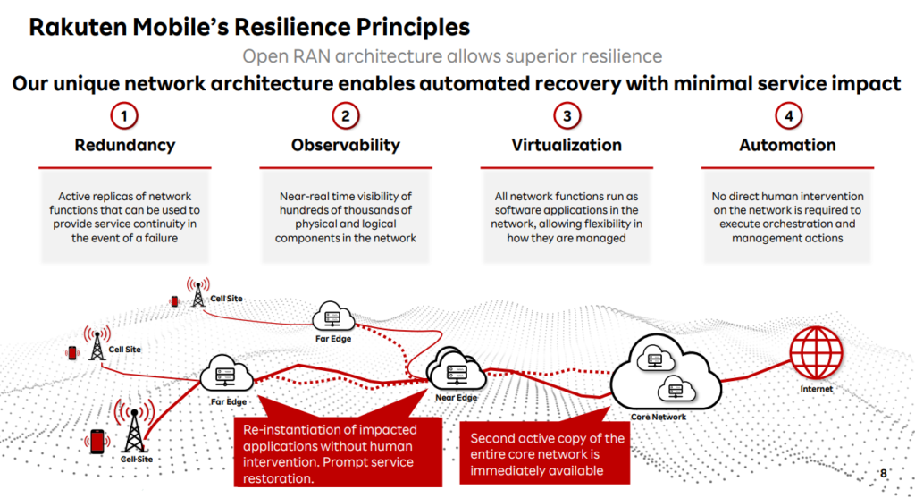 Inspired no doubt by recent major outages at Rogers and KDDI, Amin took a few minutes to highlight the features that support resilience in Rakuten Mobile’s network. The prominence of Observability is important, because it represents a significant departure from conventional telecom operations built on layers of probes, EMS, NMS and OSS. (Appledore has recently published a profile on Symphony’s Observability Framework).