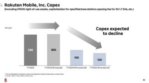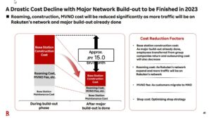 The majority of Rakuten Mobile’s 4G coverage is compete – around 15% of base stations (8,000 out of a target of 60,000+) remain to be built, by the end of 2023. During 2023, Rakuten will see a “drastic” decline in its cost base (an improvement estimated at around $110m per month).