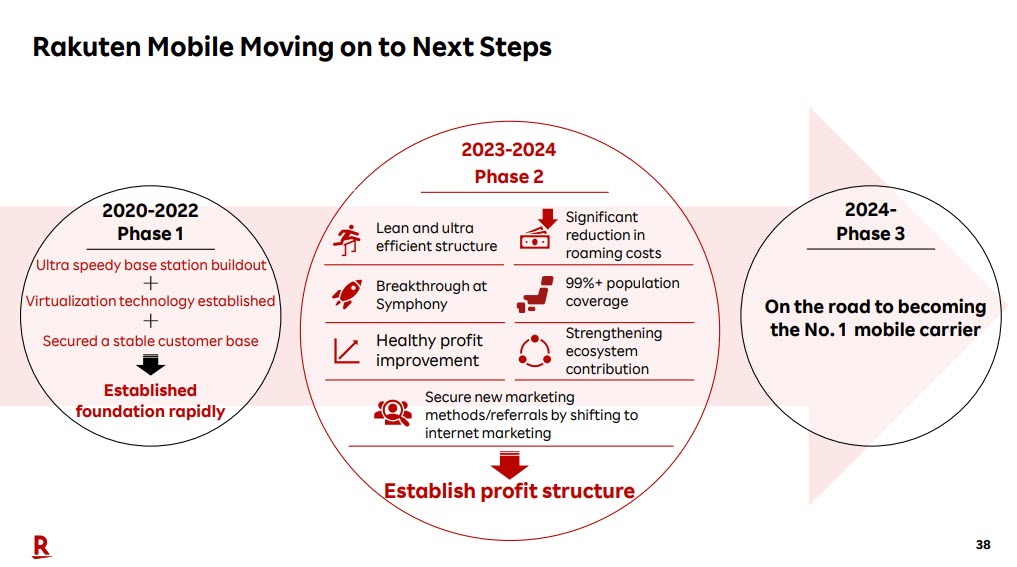 Rakuten’s initial plan for mobile had been a 7-year buildout. Instead, Rakuten accelerated that plan, based on a cloud-native and open vision, resulting in a higher rate of spend over a shorter period. Its mobile strategy now enters “phase 2” – establishing the profit structure of the business now that the buildout is largely complete with 98%+ coverage. Rakuten Mobile’s “phase 3” will be accelerating customer acquisition (massively increasing its rivals’ churn) to become Japan’s #1 mobile service provider.