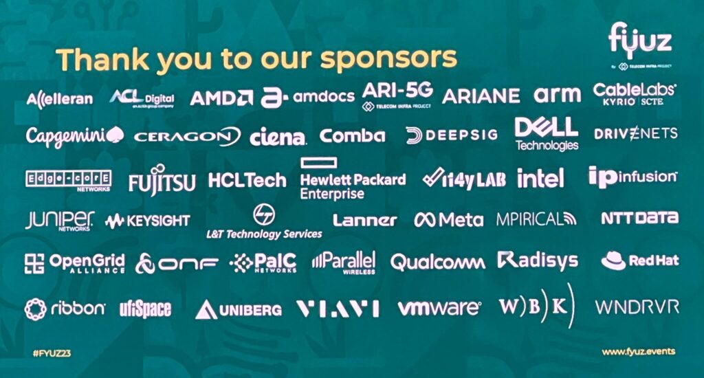 On the upside, FYUZ is still a unique event. There isn’t another telecom tradeshow where “open” gets as much of a focus. And so the show sponsors deserve credit for their commitment to the Open cause, in its multiple guises: open network software on whitebox hardware (IPInfusion, DriveNets), the boxes themselves (EdgeCore, Ufispace), platforms (Red Hat, VMware, Wind River), orchestrators (Accelleran, CapGemini, Fujitsu), test & validation (Spirent, Keysight…), open RAN software and solution providers (Rakuten Symphony, NTT DoCoMo, Mavenir), systems integration (Amdocs, Fujitsu) out-and-out disruptors (Cohere Technologies) – as well of course as the companies increasingly active at the very foundations of it all: Intel, Arm, AMD, Nvidia, Marvell… And it was good to see Parallel Wireless return to a tradeshow floor: welcome back.