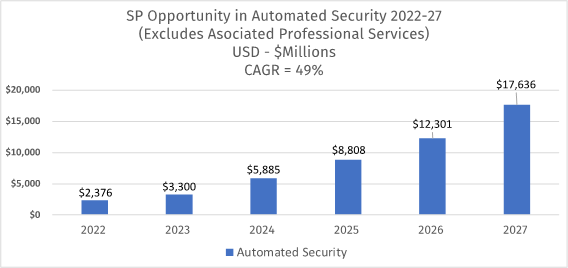 The net result is that enterprises are demanding end-to-end solutions, and telecom CSPs are best positioned to deliver those. In this forecast, we predict not only significant growth in the market for automated, managed security (rising to $17.6B in 2027) but also significant growth in CSPs’ share of that market – conditional on them raising their own game in automation.
