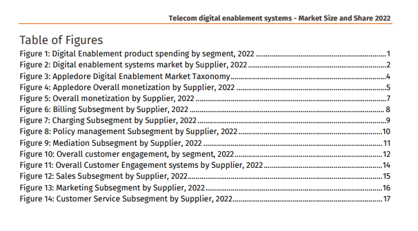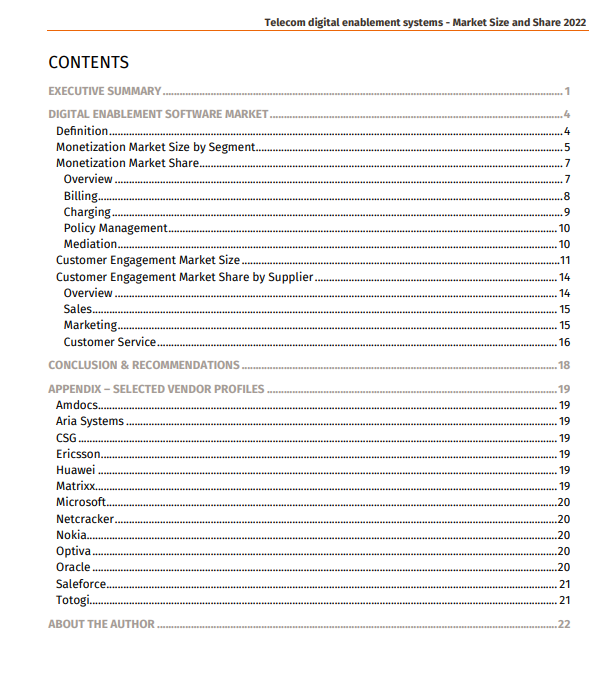 Overall market sizing and vendor share is provided. The 20-page report contains over a dozen charts and short profiles of the most notable vendors, including Amdocs, CSG, Ericsson, Netcracker, Oracle, Salesforce and Totogi. Scroll down to see the full Table of Figures and Contents.