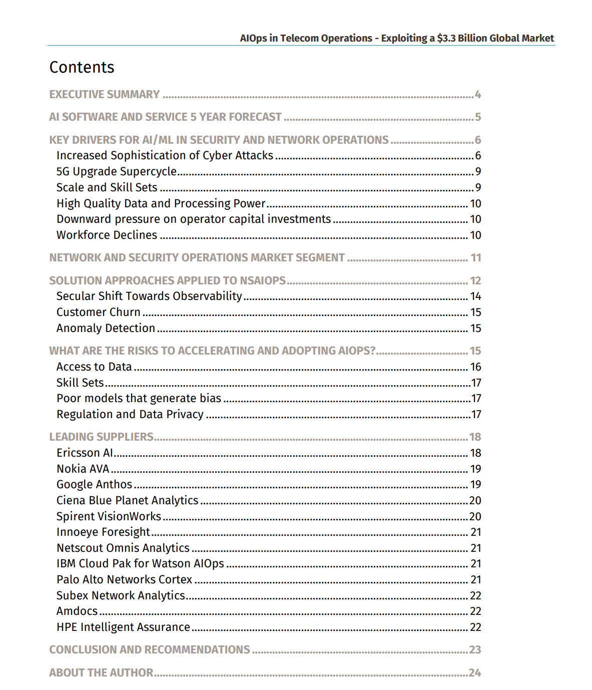 This report focuses on the predominant use cases in the telecommunications industry. We evaluate the supply and demand side economic drivers. We also consider the broader secular trends impacting the market for AIOps investments including future labor force declines. As with most fast-growing early-stage market segments business models and the ecosystem will adapt quickly prior to maturation. We profile some of the leading suppliers and identify new entrants from the larger ecosystem.