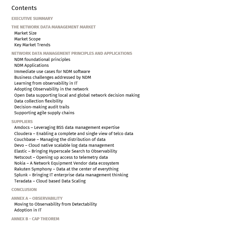 The report profiles a selection of diverse vendors whose offerings nonetheless incorporate the new principles for network data management and observability: Amdocs, Netscout and Nokia, Rakuten Symphony, Couchbase, Cloudera, Devo, Elastic, Splunk and Teradata.