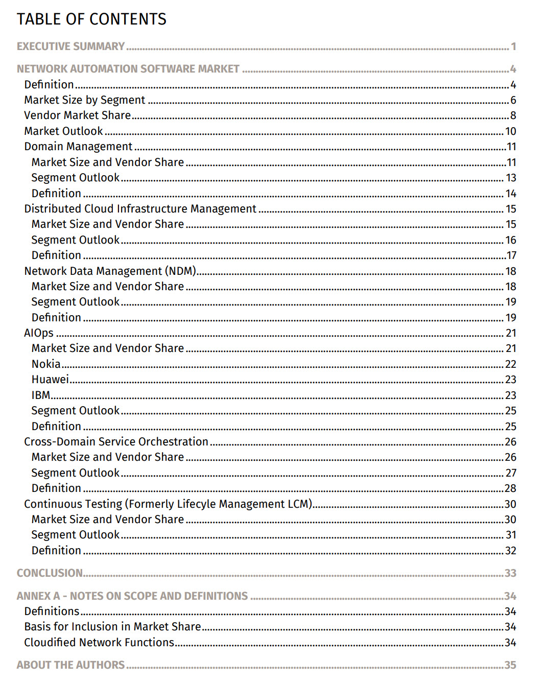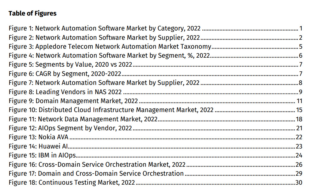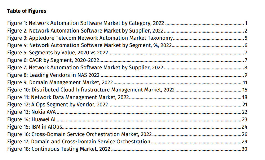 This new analysis of the telecom network automation software market provides market sizing and vendor market share estimates across multiple segments including: